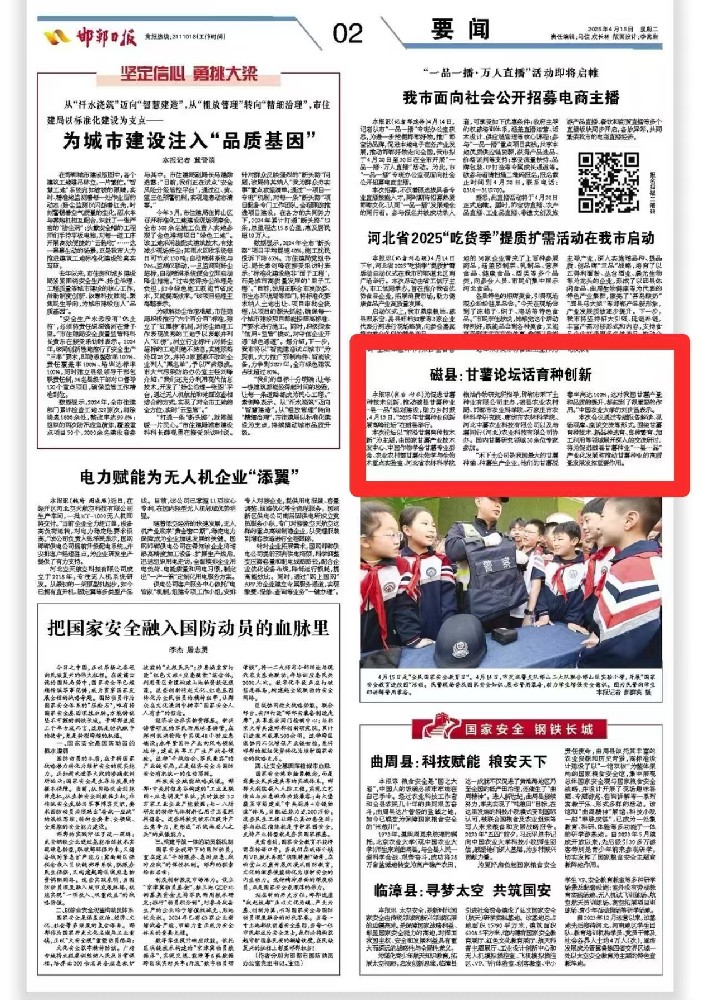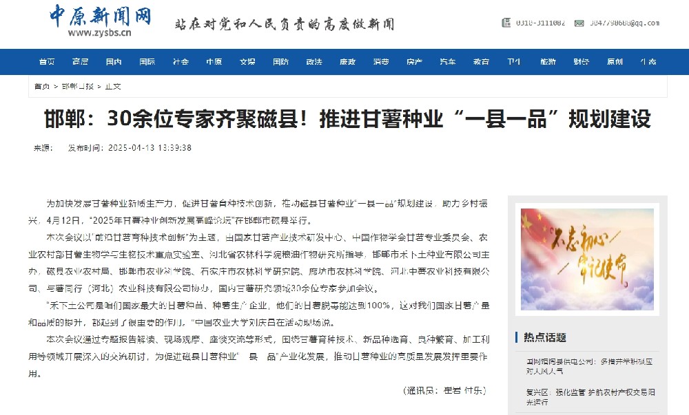2025年4月15日,邯鄲日報發(fā)布題為《磁縣:甘薯論壇話育種創(chuàng)新》的報道,此次論壇的召開,旨在促進甘薯育種技術(shù)創(chuàng)新,推動磁縣甘薯種業(yè)“一縣一品”規(guī)劃建設(shè),助力鄉(xiāng)村振興。