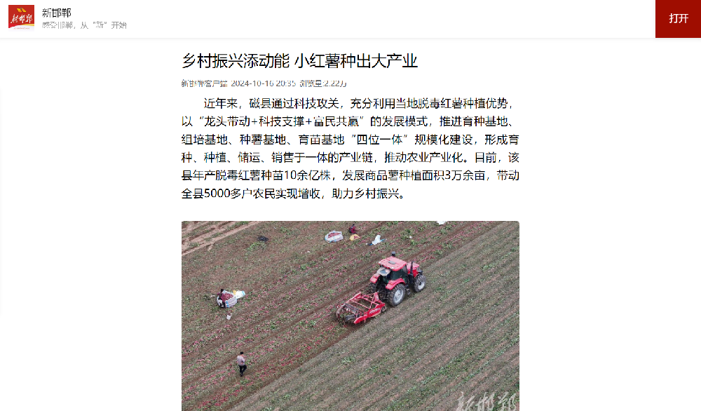 2024年10月16日,邯鄲日報(bào)社打造的平臺級移動客戶端“新邯鄲”,發(fā)布《鄉(xiāng)村振興添動能 小紅薯種出大產(chǎn)業(yè)》報(bào)道。該報(bào)道聚焦磁縣脫毒紅薯產(chǎn)業(yè),解析了磁縣這一地方特色產(chǎn)業(yè)的發(fā)展模式、規(guī)?;ㄔO(shè)及對社會經(jīng)濟(jì)的積極影響。