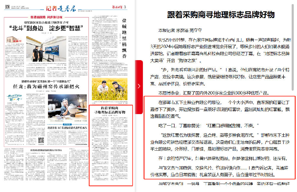 2024年10月21日,河北日報(bào)“記者走基層”版塊刊登《跟著采購商 尋地理標(biāo)志品牌好物》,報(bào)道了9月在石家莊隆重舉行的2024中國地理標(biāo)志產(chǎn)業(yè)促進(jìn)博覽會。這場博覽會匯聚了國內(nèi)外200多家企業(yè)的300多種優(yōu)質(zhì)產(chǎn)品,其中,邯鄲市禾下土種業(yè)有限公司展出的地理標(biāo)志產(chǎn)品“磁縣紅薯”尤為引人注目。版納薯憑借光滑細(xì)膩的外表、勻稱美觀的薯形以及甜糯潤香的口感,贏得了現(xiàn)場采購商的青睞,并當(dāng)即表達(dá)了與禾下土就“磁縣紅薯”進(jìn)行對接合作的意愿。