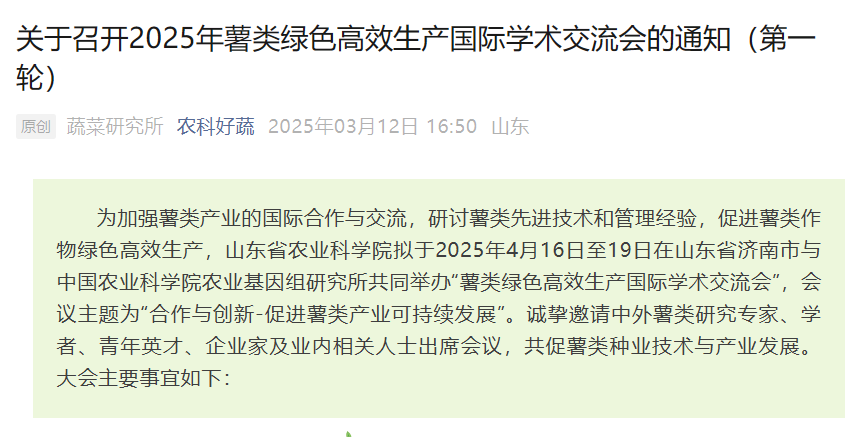 為加強(qiáng)薯類產(chǎn)業(yè)的國際合作與交流,研討薯類先進(jìn)技術(shù)和管理經(jīng)驗(yàn),促進(jìn)薯類作物綠色高效生產(chǎn),山東省農(nóng)業(yè)科學(xué)院擬于2025年4月16日至19日在山東省濟(jì)南市與中國農(nóng)業(yè)科學(xué)院農(nóng)業(yè)基因組研究所共同舉辦“薯類綠色高效生產(chǎn)國際學(xué)術(shù)交流會(huì)”。會(huì)議以“合作與創(chuàng)新-促進(jìn)薯類產(chǎn)業(yè)可持續(xù)發(fā)展”為主題,將邀請(qǐng)國內(nèi)外從事薯類研究的院士、體系首席、專家、重點(diǎn)企業(yè)負(fù)責(zé)人及其他相關(guān)人士;山東省人民政府、科學(xué)技術(shù)廳、農(nóng)業(yè)農(nóng)村廳等相關(guān)部門領(lǐng)導(dǎo)出席。圍繞全球雜交馬鈴薯聯(lián)盟(GHPA)專題研討、馬鈴薯綠色高效生產(chǎn)、甘薯綠色高效生產(chǎn)等三大主要議題開展交流研討,共促薯類種業(yè)技術(shù)與產(chǎn)業(yè)發(fā)展。會(huì)議時(shí)間:2025年4月16日-19日4月16日:全天報(bào)到4月17-18日:開幕式、專家報(bào)告4月18日下午:前往觀摩現(xiàn)場4月19日上午:觀摩滕州馬鈴薯、泗水甘薯生產(chǎn)基地4月19...