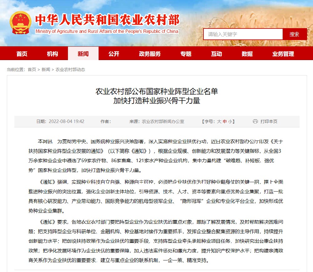 為貫徹黨中央、國務(wù)院種業(yè)振興決策部署,深入實施種業(yè)企業(yè)扶優(yōu)行動,近日農(nóng)業(yè)農(nóng)村部辦公廳印發(fā)《關(guān)于扶持國家種業(yè)陣型企業(yè)發(fā)展的通知》,根據(jù)企業(yè)規(guī)模、創(chuàng)新能力和發(fā)展?jié)摿Φ汝P(guān)鍵指標(biāo),從全國3萬余家種業(yè)企業(yè)中遴選了69家農(nóng)作物、86家畜禽、121家水產(chǎn)種業(yè)企業(yè)機構(gòu),集中力量構(gòu)建“破難題、補短板、強優(yōu)勢”國家種業(yè)企業(yè)陣型,加快打造種業(yè)振興骨干力量。邯鄲市禾下土種業(yè)有限公司憑借在甘薯種業(yè)領(lǐng)域的產(chǎn)業(yè)規(guī)模和創(chuàng)新發(fā)展優(yōu)勢,入選《國家農(nóng)作物種業(yè)陣型企業(yè)名單》。