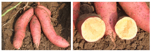該品種生長旺盛,株形匍匐,長蔓,分枝多。頂葉淺紫色,葉心形,葉脈淺綠色,莖綠色。結(jié)薯分散,單株結(jié)薯較多,薯塊大小均勻,薯形下膨美觀,薯身光滑,薯皮深紅色,薯肉桔紅色,胡蘿卜素含量高,食用品質(zhì)優(yōu),耐貯性較好。薯塊干物率平均29.33%,食味80.45分,淀粉率18.89%,胡蘿卜素含量17.30mg/100g。