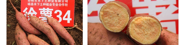 該品種赭紅皮桔紅肉,長紡錘形,蒸煮、生食口感好,許多地方已進行精包裝進超市,市民也把它作為一種禮品贈送親朋好友。徐薯34比一般的甘薯品種早熟20~30天,能早收早上市,彌補市場空缺,經(jīng)濟效益高,特別適宜城郊地區(qū)發(fā)展。