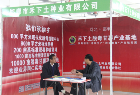 2014年10月19日山東省聊城農(nóng)產(chǎn)品產(chǎn)銷對(duì)接會(huì)暨第二屆水城金秋綠色食品博覽會(huì)在聊城農(nóng)產(chǎn)品物流交易中心隆重開幕,博覽會(huì)以優(yōu)質(zhì)農(nóng)產(chǎn)品展銷、對(duì)接為核心,展覽面積20000平方米,邀請(qǐng)全國約450個(gè)優(yōu)質(zhì)農(nóng)產(chǎn)品生產(chǎn)、加工、規(guī)模化育苗、育種等企業(yè)參展。邯鄲市禾下土種業(yè)有限公司作為國內(nèi)領(lǐng)先的脫毒甘薯種苗、種薯生產(chǎn)企業(yè)應(yīng)邀出席、參展?! ?博覽會(huì)上,邯鄲市禾下土種業(yè)有限公司總經(jīng)理崔伏喜為與會(huì)企業(yè)介紹了禾下土脫毒甘薯產(chǎn)業(yè)基地的建設(shè)發(fā)展情況,并與全國各地20余家甘薯(紅薯)育苗、生產(chǎn)、加工企業(yè)進(jìn)行了產(chǎn)業(yè)對(duì)接,有效推動(dòng)了脫毒甘薯產(chǎn)業(yè)的快速發(fā)展。與客戶業(yè)務(wù)洽談山東省聊城農(nóng)產(chǎn)品產(chǎn)銷對(duì)接會(huì)暨第二屆水城金秋綠色食品博覽會(huì)延伸閱讀: 邯鄲市禾下土種業(yè)有限公司成立于2002年1月,是一家集農(nóng)業(yè)科研、育種、試驗(yàn)示范、新...